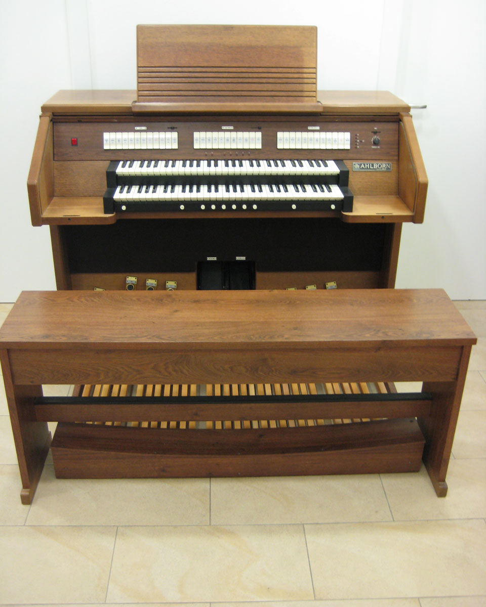 Das digitale Ahlborn-Modell DS 25 hat 31 Register, besitzt ein 30-Tasten-Pedal konkav-parallel, eine Bank mit Notenfach, Pedalbeleuchtung und einen Rollladen. Gehäuse Eiche dunkel.